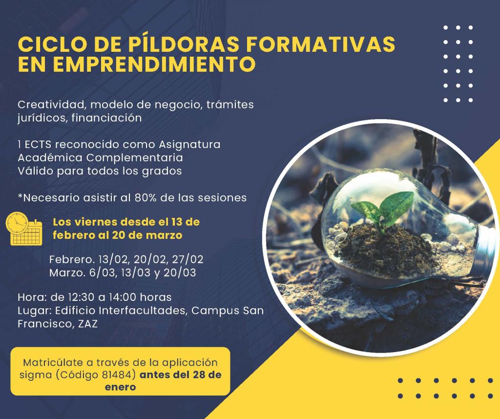 Por indicación del Vicerrector de Innovación, Transferencia y Formación Permanente, Manuel González Bedia, se remite información relativa al Ciclo de Píldoras Formativas en Emprendimiento, una iniciativa dirigida a todo el estudiantado de la Universidad de Zaragoza, independientemente de su área de formación.