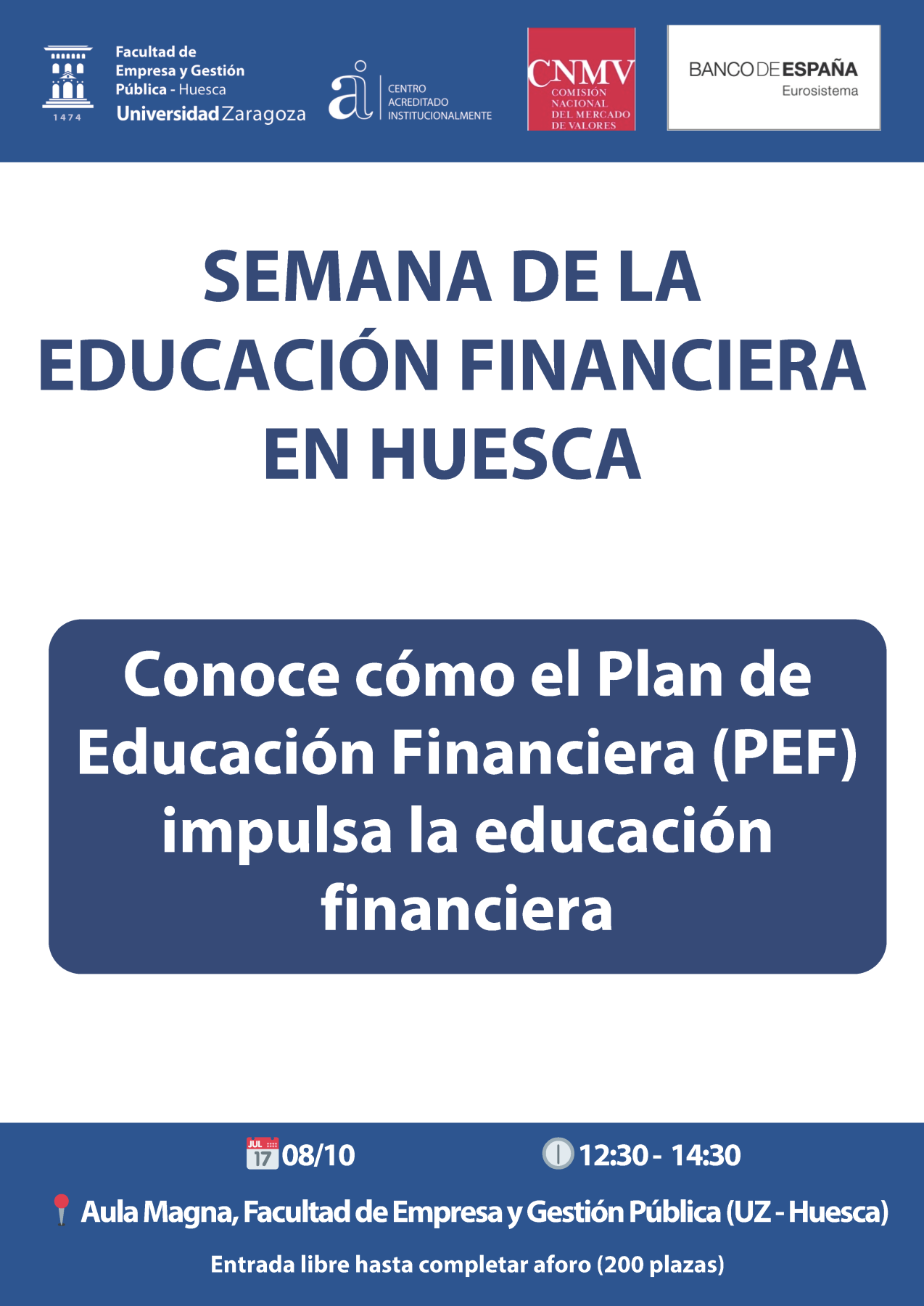 Con motivo de la Semana de la Educación Financiera, el Plan de Educación Financiera (PEF) en Aragón, en colaboración con el Banco de España y la Facultad de Empresa y Gestión Pública de Huesca (Universidad de Zaragoza), organiza una actividad especial destinada a acercar la cultura financiera a toda la comunidad universitaria y a la ciudadanía en general.